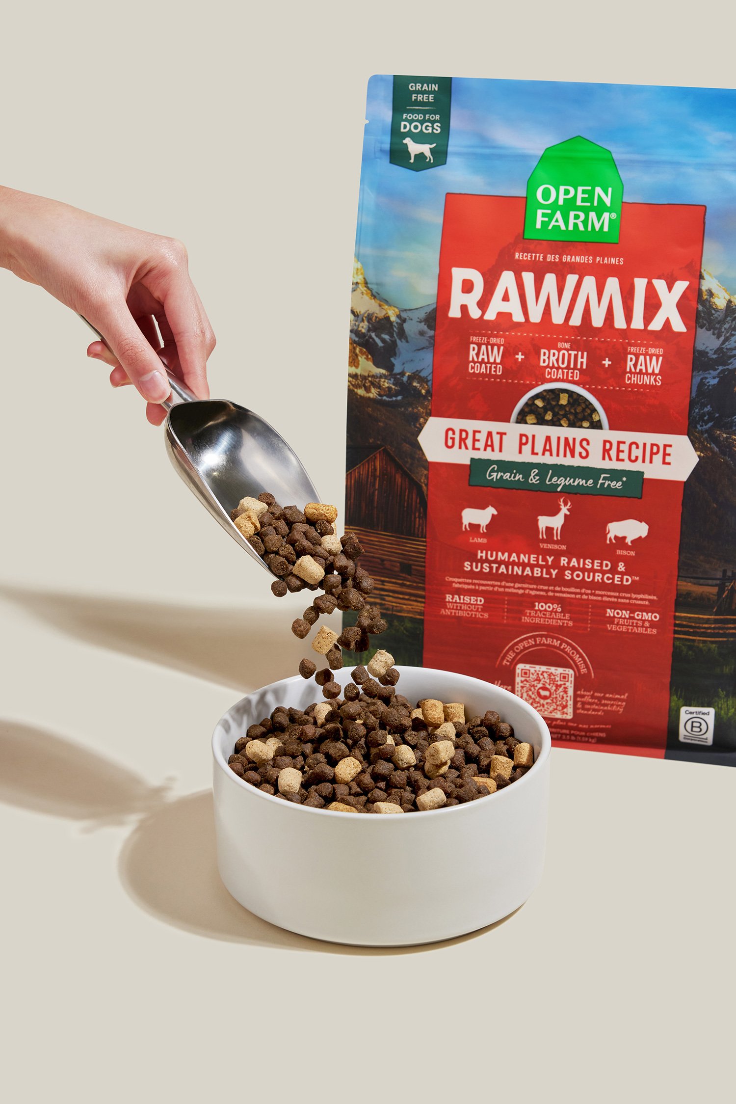 Styled of dog's food product view from front with hand incorporate photographed to show the actual product.